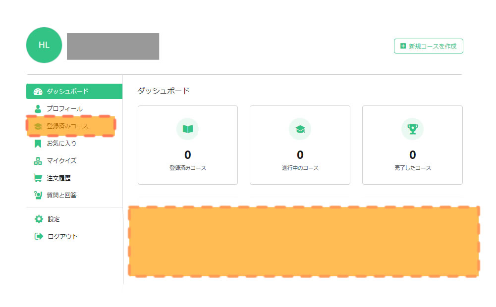 左にある、メニューの「登録済みコース」(オレンジ枠部分)を選びます。