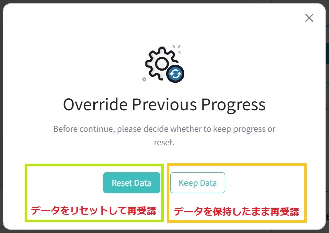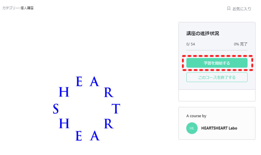 赤枠部分に、初回の場合「学習を開始する」、2回目からは「コースを続ける」と表示されますので、ここをクリックします。
