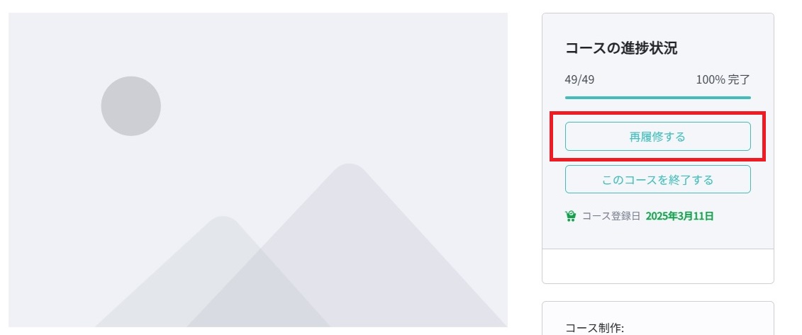 ※ 講義動画の無い項目(提出ワーク・テキストのダウンロード・受講ガイドのページ)で、チェックマークを付けたいときも、右画面下(または環境による右上)で【完了にする】を選択すると、チェックマークが入ります。